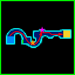 | 画像について | 赤矢印→は、メインとなるヘリリンの移動を示します。 ★(紫色の星)は、バネに当たることを示します。 ★(橙色の星)は、壁にわざとぶつかることを示します。 |